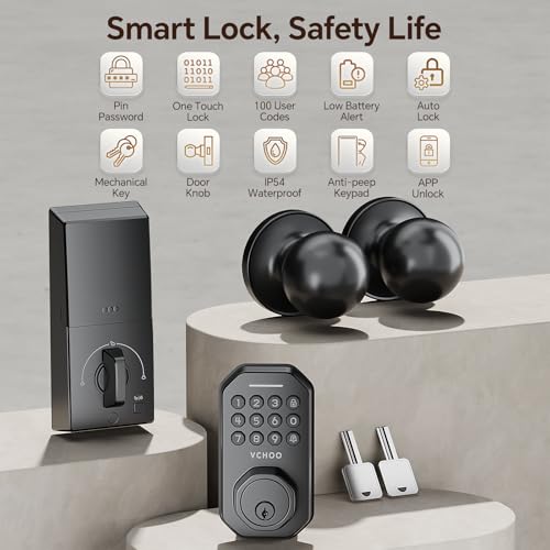 - 3 in 1 Keyless Entry Door Lock: VCHOO door locks for front door supports multiple ways to unlock: App Control, 100 user codes, one-time code, 2 physics keys. Keypad door lock with handle play an important role in self-housing, hosts, offices, rental property management, hotels.
