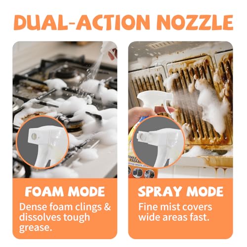 - 2-in-1 Dual Nozzle – The dual nozzle design can switch between fine spray and foam flow, allowing you to easily tackle light and heavy cleaning needs in different home scenarios: use the fine spray for quick tasks like dusting appliance exteriors or wiping up countertop spills, and flip to the foam mode for tough jobs such as cutting through cooktop grease, degreasing range hoods, or deep-cleaning shower tile.