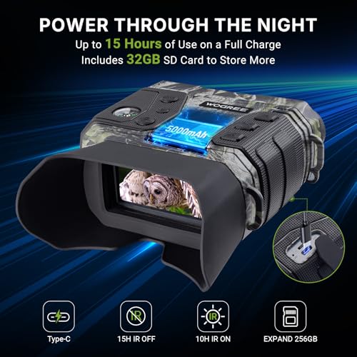 - ?5,000mAh Battery & 32GB Storage? Wogree night vision goggles for adults are equipped with a powerful 5,000mAh rechargeable battery, delivering up to 14 hours of runtime–ideal for extended outdoor observation. A 32GB memory card comes standard (expandable up to 256GB), allowing you to store more than 3,200 36MP HD photos without frequent card changes or storage cleanup.