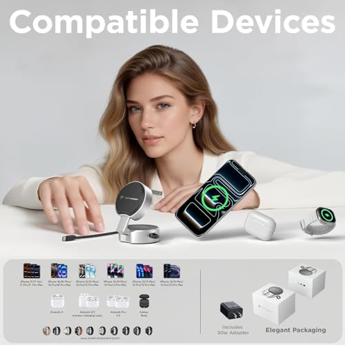 - ??PERFECT GIFTS FOR MEN AND WOMEN?Superior design and pretty packaging, this wireless charging station is not only the best charging accessory for the desktop and bedside, but the perfect decoration and gift for your friends and family! You will get a 3 in 1 charging station for apple, 0.8m charging cable, 30W adapter, a user guide.