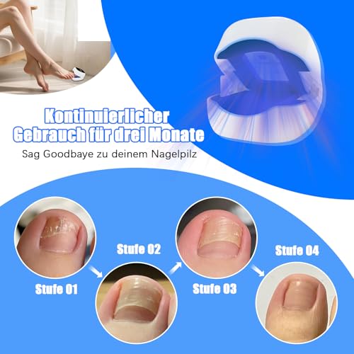 - THERAPIE DE LA LUMIERE : 2 x 910 nm infrarouge et 4 x 470 nm de lumiere bleue peuvent penetrer efficacement dans les ongles et detruire les parois des cellules fongiques. L’oeil humain ne peut voir que la lumiere entre 400 et 800 nanometres, de sorte que si vous constatez que l’une des lumieres sur ce produit n’est pas allumee, ne vous inquietez pas, c’est un phenomene normal.
